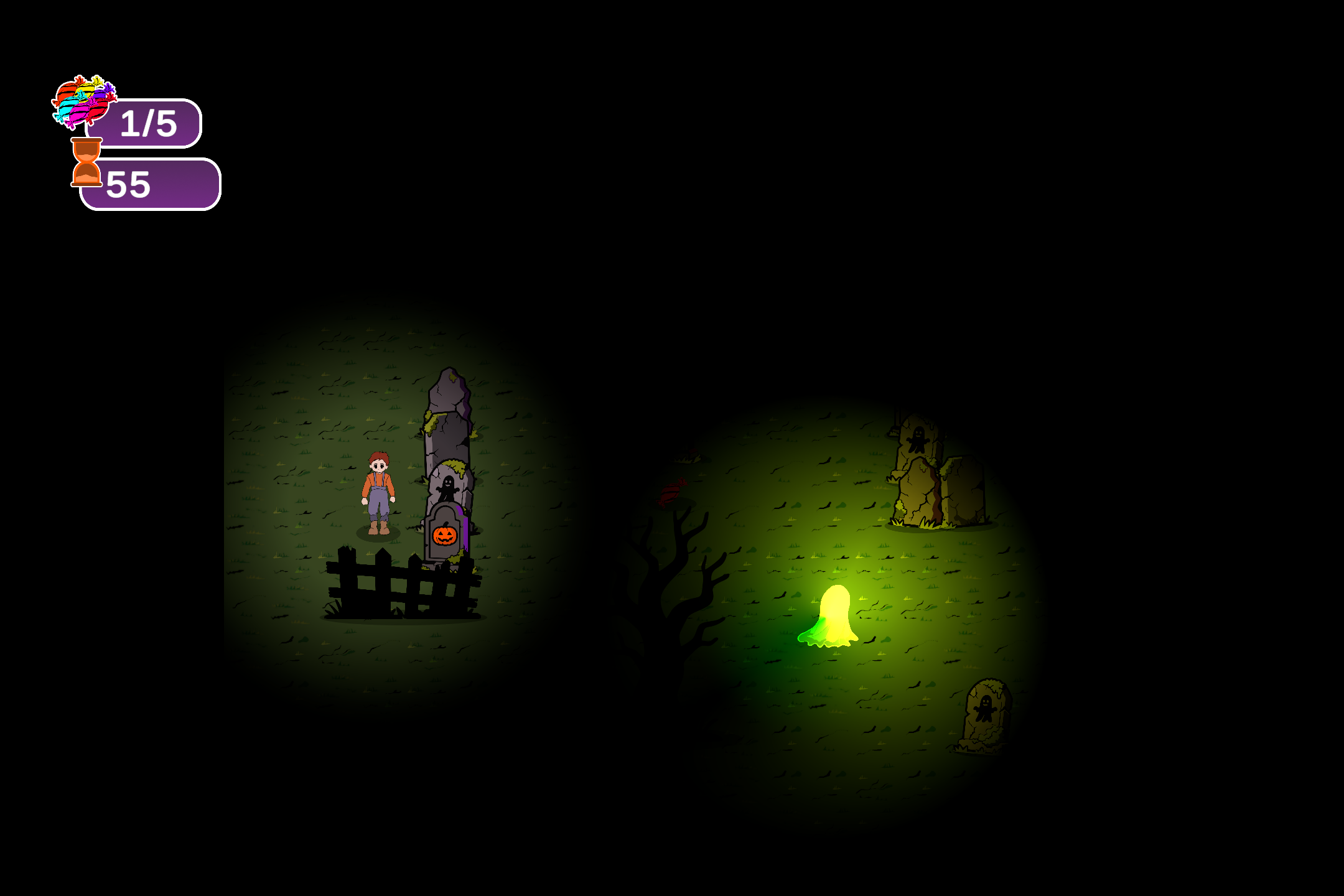 Spooky Time is a short stealth game where you wander through a haunted neighborhood, collecting candies while avoiding roaming ghosts. Stay out of their detection cones, hide behind fences, and move carefully — one wrong step, and you’re caught.